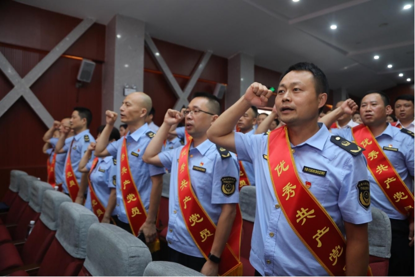 表彰大會在莊嚴的國歌聲中拉開帷幕。在向玉超的帶領下,全體黨員重溫入黨誓詞。會上,為“光榮在黨50年”的黨員代表頒發紀念獎章,為榮獲2024年度市局“優秀共產黨員”“優秀黨務工作者”稱號的代表及“先進基層黨組織”頒發證書和獎牌。