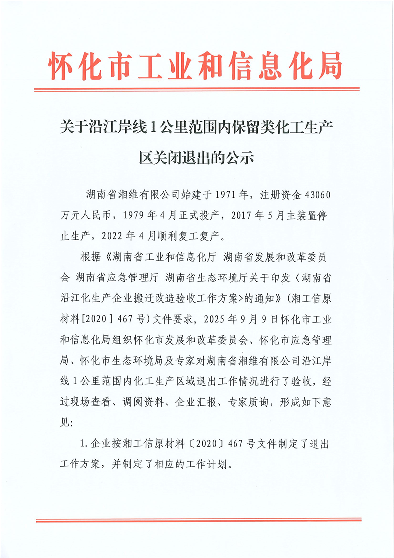 關于沿江岸線1公里范圍內保留類化工生產區關閉退出的公示