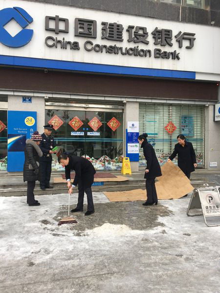 1月25日,建行懷化分行網(wǎng)點啟動應(yīng)急預(yù)案,鏟冰掃雪、鋪設(shè)紅地毯,進(jìn)一步做好冰災(zāi)期間營業(yè)網(wǎng)點的客戶服務(wù)工作(王承 攝)