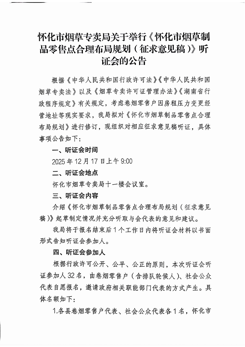 懷化市煙草專賣局關于舉行《懷化市煙草制品零售點合理布局規劃(征求意見稿)》聽證會的公告