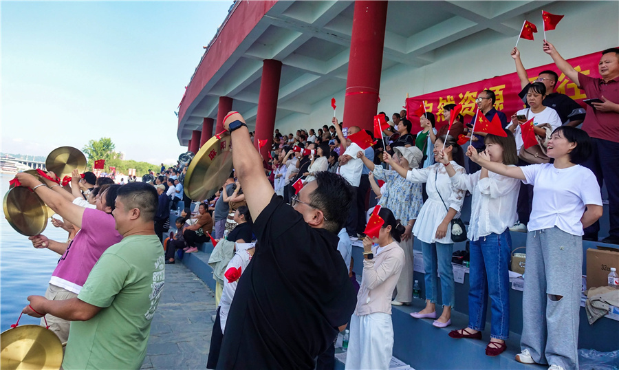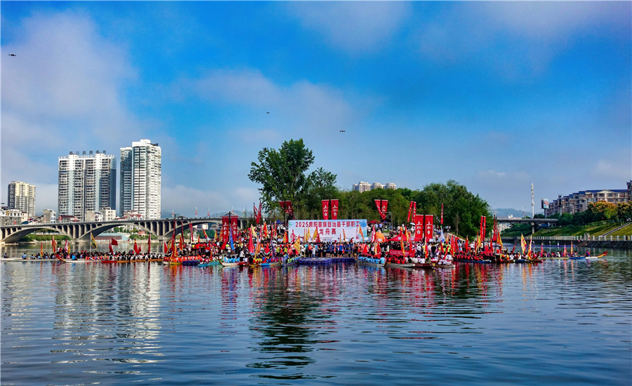 9月28日,2025年麻陽干部職工龍舟大賽在縣城錦江河段鳴鑼開賽,56支隊伍參與比賽,賽期3天。本次賽事項目為男女混合22人標(biāo)準龍舟300米直道競速。(陳剛 攝)