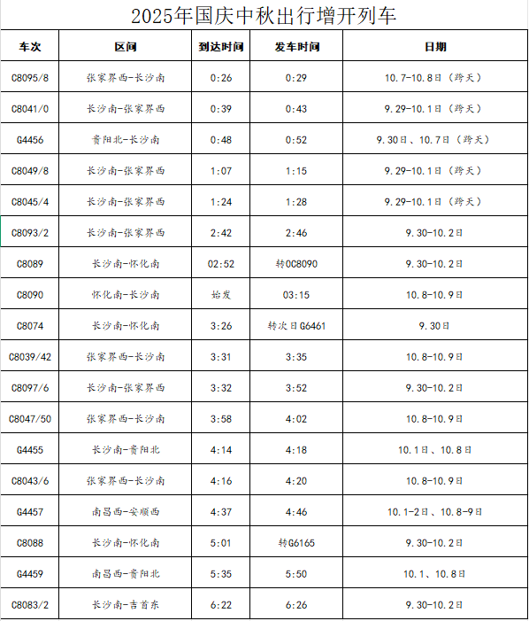 記者從懷化高鐵南站獲悉,為更好地滿足廣大旅客的出行需求,懷化高鐵南站將加開多趟列車,服務旅客探親、旅游出行。具體如下: