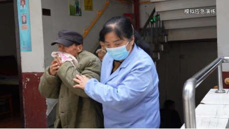 上午9 點(diǎn),演練正式開始。隨著“火情警報(bào)”響起,模擬福利院宿舍樓突發(fā)“火災(zāi)”,現(xiàn)場濃煙彌漫。工作人員第一時間發(fā)出警報(bào),迅速向演練總指揮匯報(bào)火情,同時啟動應(yīng)急預(yù)案。工作人員協(xié)助老人用濕毛巾捂住口鼻、低姿彎腰,引導(dǎo)他們按照預(yù)定疏散路線有序撤離。對于受傷老人,醫(yī)務(wù)人員直接用擔(dān)架抬離至安全區(qū)域進(jìn)行緊急救治。