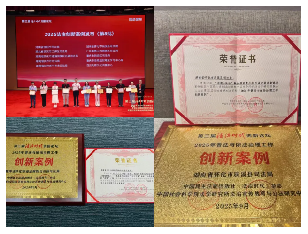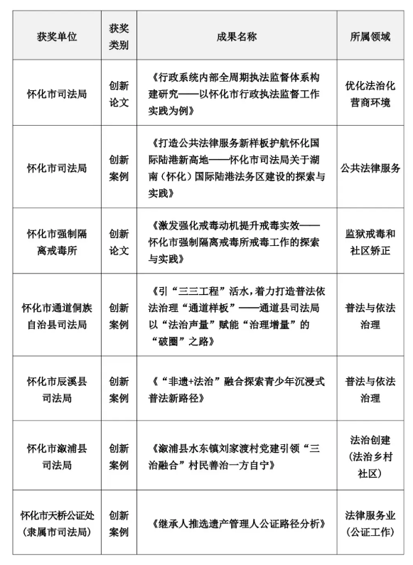 近日,由中國民主法制出版社聯(lián)合中國社會科學(xué)院法學(xué)研究所主辦的第三屆法治時代創(chuàng)新論壇暨全民普法 40 周年研討會、首屆法治發(fā)展創(chuàng)新研討會、首屆法律服務(wù)業(yè)高質(zhì)量發(fā)展研討會公布 “2025年法治創(chuàng)新案例和創(chuàng)新論文” 等入選名單。懷化市司法局、所轄縣市區(qū)司法局及懷化市強(qiáng)制隔離戒毒所憑借在法治實(shí)踐中的創(chuàng)新探索與突出成效,多點(diǎn)發(fā)力、斬獲佳績,共榮獲7項全國性法治創(chuàng)新榮譽(yù),懷化市司法局、通道縣龔靜分別獲優(yōu)秀供稿單位、優(yōu)秀通訊員稱號。