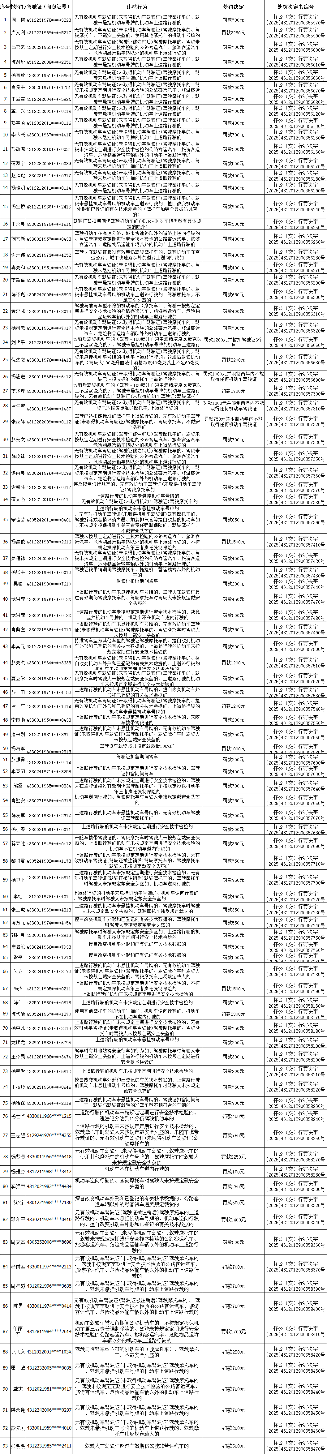 下列違法行為人因道路交通安全違法行為(附名單),被我大隊依法作出行政處罰決定。現(xiàn)因我大隊采取其他方式無法送達,根據(jù)《中華人民共和國民事訴訟法》第九十五條之規(guī)定,特予以公告送達。公告期為30日,公告期滿視為送達。自送達行政處罰決定書之日起,下列交通違法行為人同時被給予罰款處罰的,應當在15日內(nèi)到我大隊(懷化市鶴城區(qū)迎豐中路太平橋)或者通過全國公安交通管理“交管12123”手機平臺(錄入行政處罰決定書編號)繳納罰款。逾期不繳納的,每日按規(guī)定罰款額的百分之三加處罰款,加處罰款的數(shù)額不超過罰款本數(shù)。下列交通違法行為人如不服本決定,可以自送達行政處罰決定書之日起60日內(nèi)向懷化市鶴城區(qū)人民政府申請行政復議;或者在6個月內(nèi)向懷化鐵路運輸法院提起行政訴訟。