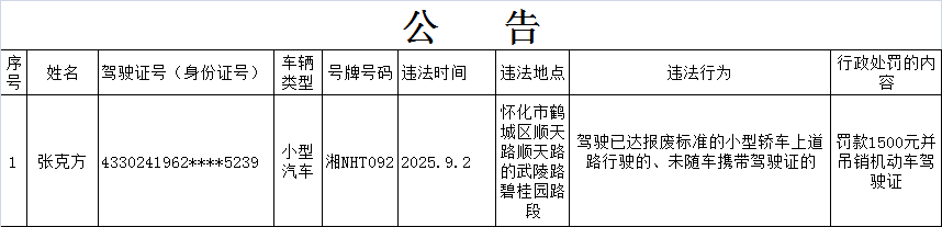 下列道路交通違法行為人(詳細名單以及交通違法的事實、處罰種類、罰款金額等相關內(nèi)容附后),因涉嫌實施了駕駛拼裝或者達到報廢標準的機動車上道路行駛等道路交通安全違法行為,其行為違反了《中華人民共和國道路交通安全法》第14條等交通法律法規(guī),根據(jù)《中華人民共和國道路交通安全法》第100條第1款、第2款以及《湖南省實施<中華人民共和國道路交通安全法>辦法》第61條第7項等規(guī)定,擬應依法給予罰款并吊銷機動車駕駛證的行政處罰。因道路交通違法行為人無正當理由未在法定期限內(nèi)來我大隊接受處理,且經(jīng)我隊采取電話、郵寄、公告等方式依法告知,在告知期滿后三十日內(nèi)仍未來我隊接受處理。現(xiàn)依據(jù)《湖南省實施<中華人民共和國道路交通安全法>辦法》第46條第2款的規(guī)定,我隊依法予以公告,公告期為七日。請以下道路交通違法行為人在公告期內(nèi)及時來我大隊(地址:懷化市鶴城區(qū)迎豐中路太平橋)接受處理,如有異議有權提出陳述和申辯,處吊銷機動車駕駛證或者單筆罰款金額超過二千元的處罰還可申請聽證。逾期,我隊將依法作出行政處罰決定。
