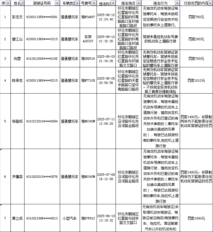 下列道路交通違法行為人(附名單以及交通違法的事實(shí)、法律依據(jù)、處罰種類、罰款金額等相關(guān)內(nèi)容),因涉嫌實(shí)施了附后所列舉的道路交通安全違法行為,根據(jù)《中華人民共和國道路交通安全法》等法律法規(guī),擬應(yīng)依法給予相應(yīng)的行政處罰。因道路交通違法行為人無正當(dāng)理由未在法定期限內(nèi)來我大隊(duì)接受處理,且經(jīng)我隊(duì)依法郵寄告知書被退回,現(xiàn)依據(jù)《湖南省實(shí)施<中華人民共和國道路交通安全法>辦法》第46條第2款、《中華人民共和國民事訴訟法》第95條等法律規(guī)定,我隊(duì)在此采取公告方式依法予以告知,本公告期為三十日。請以下道路交通違法行為人在公告期內(nèi)以及公告期滿后三十日內(nèi)到我大隊(duì)(地址:懷化市北環(huán)路501號(hào))接受處理,如有異議有權(quán)提出陳述和申辯,處吊銷機(jī)動(dòng)車駕駛證或單筆罰款金額超過二千元的處罰還可申請聽證。逾期,我隊(duì)將繼續(xù)依照法定程序辦案。