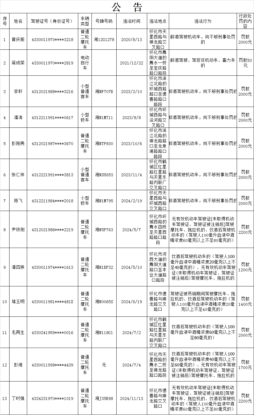 下列道路交通違法行為人(詳細(xì)名單以及交通違法的事實(shí)、處罰種類、罰款金額等相關(guān)內(nèi)容附后),因涉嫌實(shí)施了飲酒后駕駛機(jī)動(dòng)車上道路行駛等道路交通安全違法行為,其行為違反了《中華人民共和國(guó)道路交通安全法》第22條第2款等法律法規(guī),依據(jù)《中華人民共和國(guó)道路交通安全法》第91條等規(guī)定,擬應(yīng)依法給予暫扣機(jī)動(dòng)車駕駛證六個(gè)月并處罰款的行政處罰。因道路交通違法行為人無(wú)正當(dāng)理由未在法定期限內(nèi)來(lái)我大隊(duì)接受處理,且經(jīng)我隊(duì)采取電話、郵寄、公告等方式依法告知,在告知期滿后三十日內(nèi)仍未來(lái)我隊(duì)接受處理?,F(xiàn)依據(jù)《湖南省實(shí)施<中華人民共和國(guó)道路交通安全法>辦法》第46條第2款的規(guī)定,我隊(duì)依法予以公告,公告期為七日。請(qǐng)以下道路交通違法行為人在公告期內(nèi)及時(shí)來(lái)我大隊(duì)(地址:懷化市河西南山寨路1號(hào))接受處理,如有異議有權(quán)提出陳述和申辯,處吊銷機(jī)動(dòng)車駕駛證或者單筆罰款金額超過(guò)二千元的處罰還可申請(qǐng)聽(tīng)證。逾期,我隊(duì)將依法作出行政處罰決定。