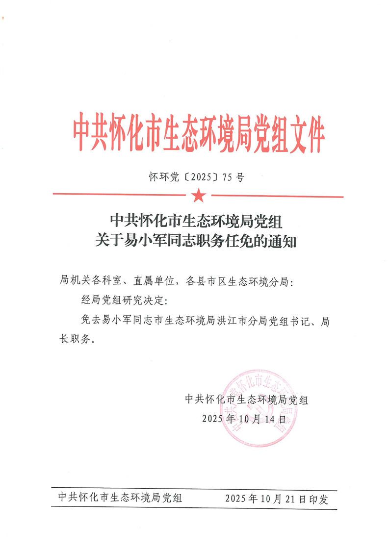 關于易小軍同志職務任免的通知(懷環黨〔2025〕75號)