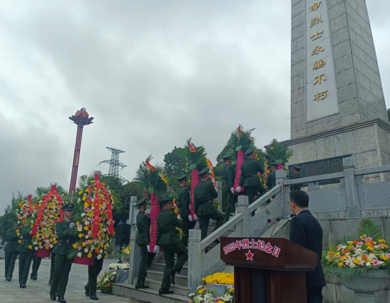 伴隨著深情的《獻花曲》響起,14名禮兵抬起7個花籃,正步向前,拾級而上,將花籃整齊擺放在烈士紀念碑前?;ɑ@紅色緞帶上“英雄烈士永垂不朽”的金色大字熠熠生輝,寄托著對英烈的無限哀思和崇高敬意。