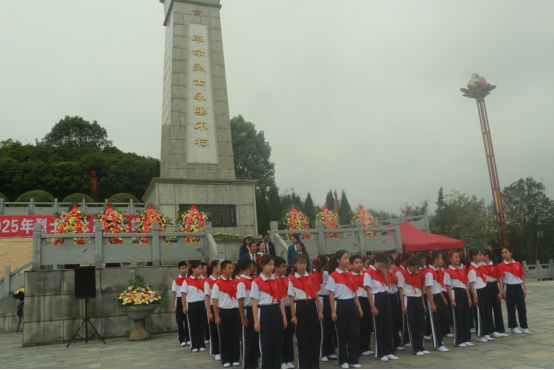秋日清晨,蒼松翠柏掩映下的烈士紀念碑廣場花團錦簇、靜穆莊嚴。9時整,儀式開始,全場齊聲高唱中華人民共和國國歌。國歌唱畢,全場肅立,向烈士默哀。隨后,少先隊員們齊唱《我們是共產主義接班人》,向烈士致敬。
